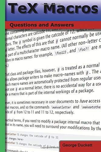 If you have a question about TeX Macros this is the book with the answers. TeX Macros: Questions and Answers takes some of the best questions and answers asked on the tex.stackexchange.com website. You can use this book to look up commonly asked questions, browse questions on a particular topic, compare answers to common topics, check out the original source and much more. This book has been designed to be very easy to use, with many internal references set up that makes browsing in many different ways possible. Topics covered include: Tex Core, Expansion,.